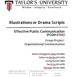 The Intended Learning Outcome (ILO) of this group assignment is to allow us to be able to understand the basic ideas and concepts clearer which learnt in Effective Public Communication class. In group of 5, we had to choose a topic and the way to present it either in comic form or drama scripts. My gruop members were Dulcie Chin, Esther Lim, Lee Pui Sun and Teh Kuan Yon. Our group chose the topic of Organizational Communication and present it in comic form. Most of our comic was related in office and works and our concepts were formal communication, communication culture and conflict management skills.